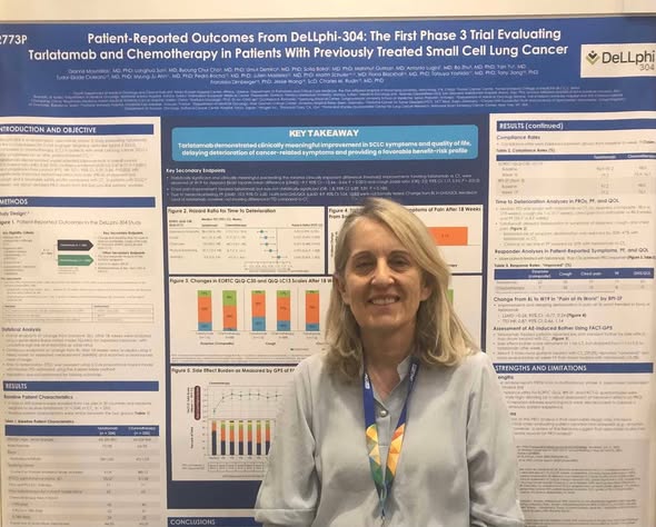 Σημαντικά τα αποτελέσματα της μελέτης DeLLphi 304 που παρουσίασε στο Παγκόσμιο Ογκολογικό Συνέδριο ESMO 2025, η Ογκολόγος, υπεύθυνη του Τμήματος Νέων Ογκολογικών φαρμάκων Δρ. Σοφία Μπάκα.Σύμφωνα με τη μελέτη DeLLphi-304, η χορήγηση του tarlatamab βελτίωσε σημαντικά τα συμπτώματα και την ποιότητα ζωής και τα συμπτώματα των ασθενών με μικροκυτταρικό καρκίνο του πνεύμονα (SCLC). Σπουδαία στιγμή για την ανοσοθεραπεία και μια πραγματική ανάσα ελπίδας για τους ασθενείς